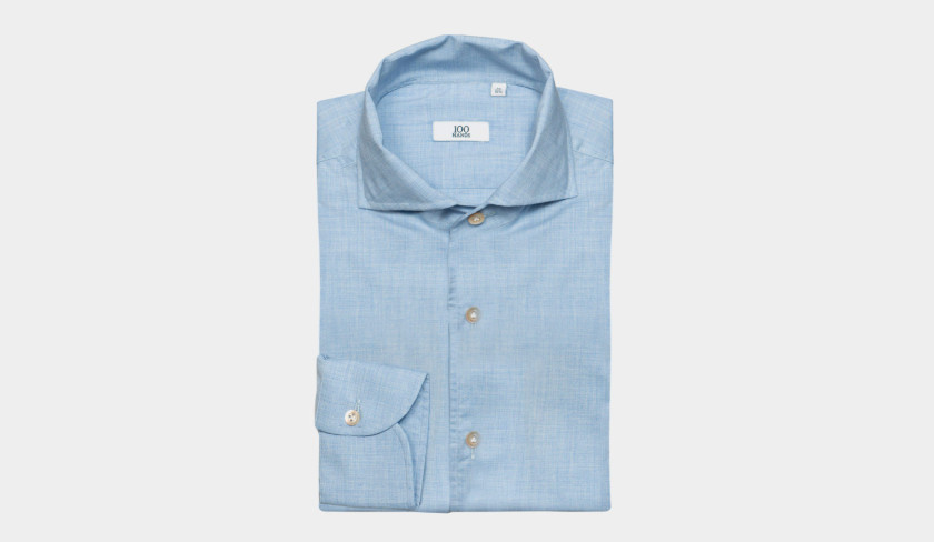 This fresh light blue shirt is crafted from a lightweight textured fabric, making it breathable and ideal for layering under knitwear. Its standout feature is the signature 'Schiller' collar, also known as the 'California' collar, cut from a single piece of bias fabric that flows seamlessly from chest to collar and back. Finished with hand-sewn details on the front, collar, and gussets, this shirt is a testament to refined craftsmanship.