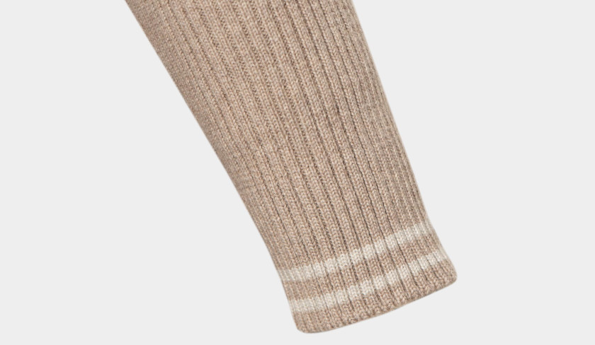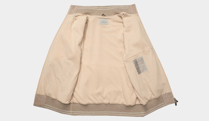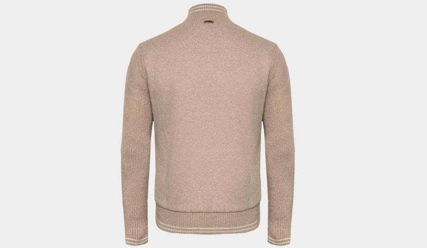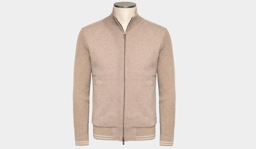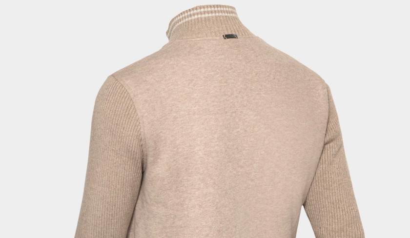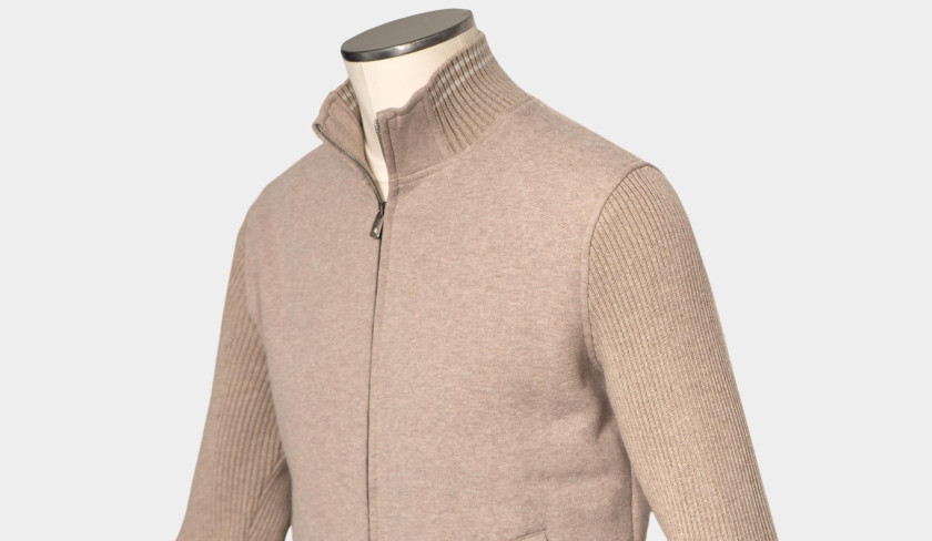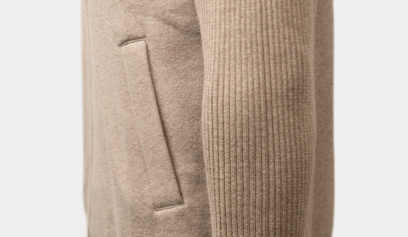 Casual-chic full-zip sweatshirt, crafted from a luxurious melange fleece in warm cotton and cashmere for exceptional softness and comfort. The sleeves, collar, and waistband are finished in a cozy wool knit that feels enveloping to the touch. The sweatshirt is detailed with a front zip featuring a double logoed puller, two side pockets, an internal chest pocket, and a discreet metal logo plate at the back of the collar. Lined with winter cotton, the interior effectively absorbs moisture while ensuring optimal thermal comfort.