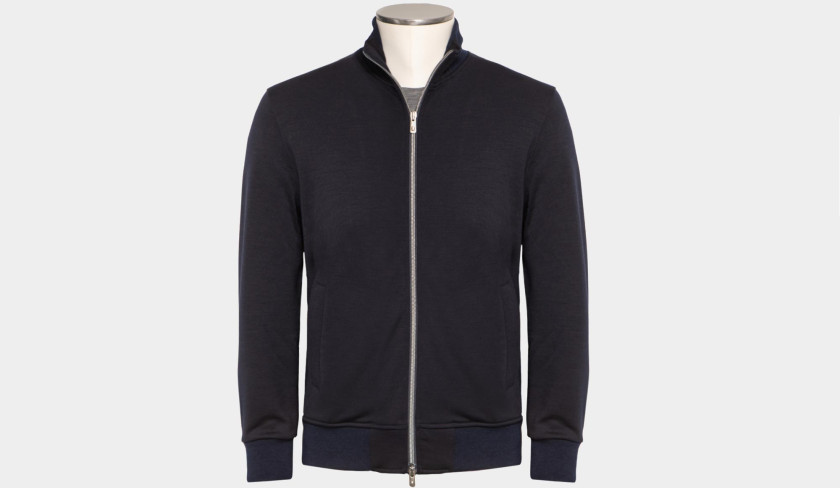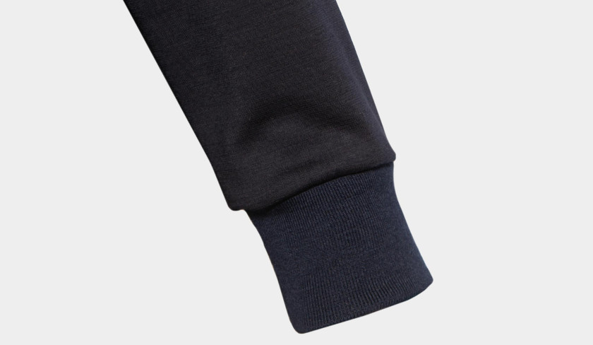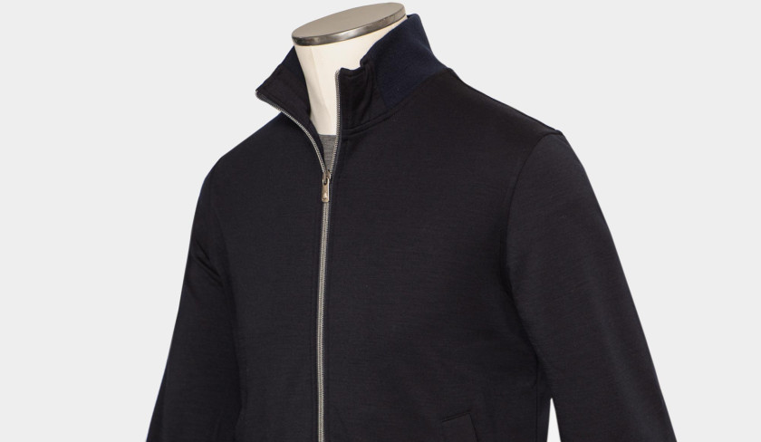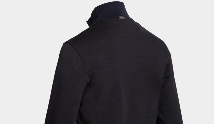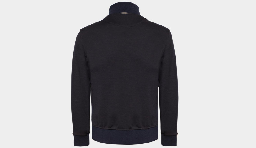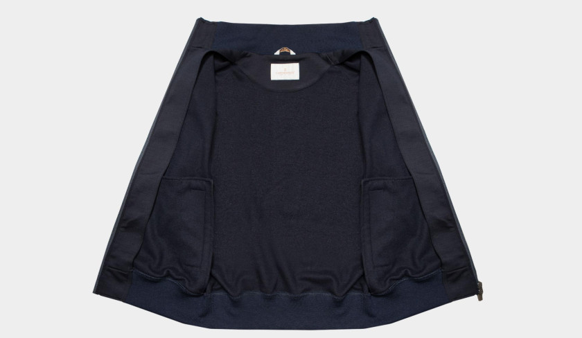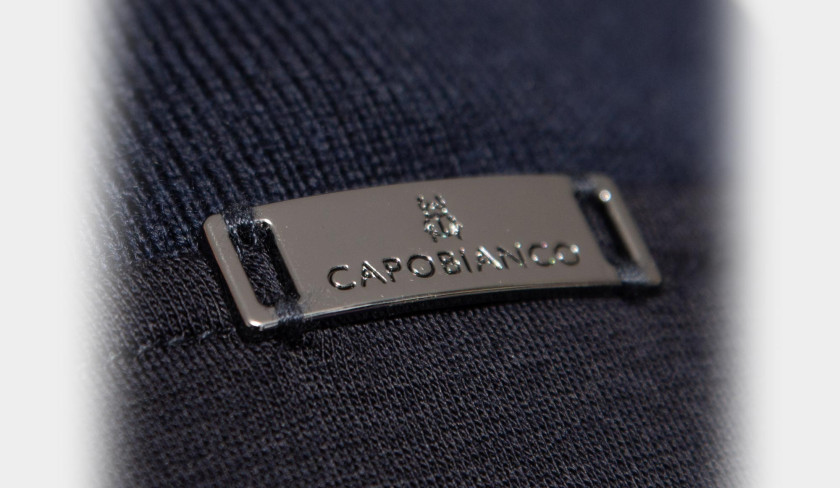 Capobianco’s navy blue cardigan blends casual elegance with a leisure-chic attitude. Designed in a double-zip hoodie style, it features a stand-up collar, two side pockets, and an elastic waistband with matching cuffs for a comfortable fit. The double zip closure is accented with the embossed Capobianco name, while a discreet metal plate at the back of the neck adds a refined finishing touch.
