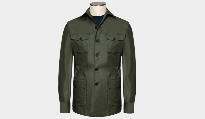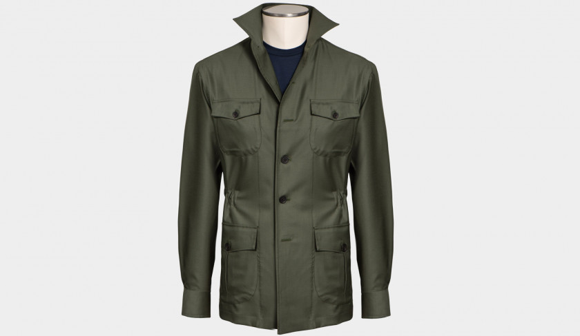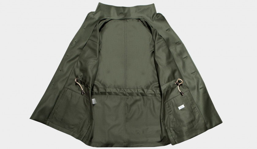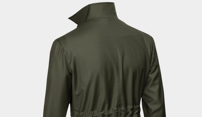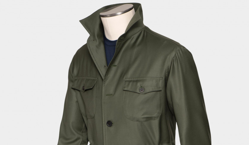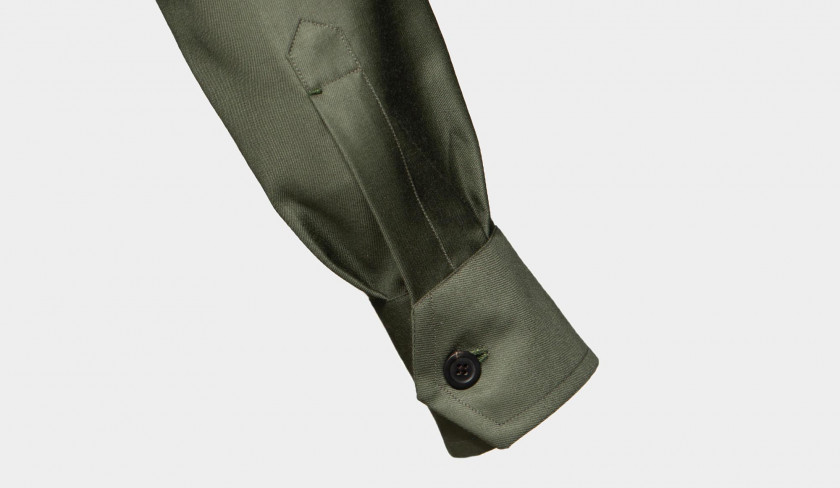 Sports elegant shirt jacket, a mix between a jacket, sahariana and a shirt, made by Fralbo Napoli. The fabric is a 100% wool from the "Drapers Mill" in beautiful green tone color. The face side has a twill texture. This item has hand-made button holes, handstitched, pleated shoulder, one-piece collar and more handstitched details like on the yoke and upper front stitching. Furthermore there is a inner waist adjuster, elegant shirt collar and shirt cuffs finish on the sleeves.