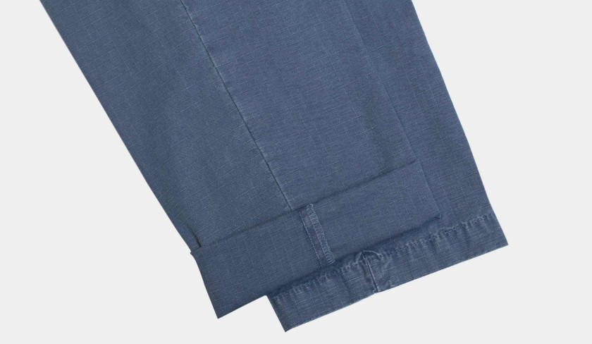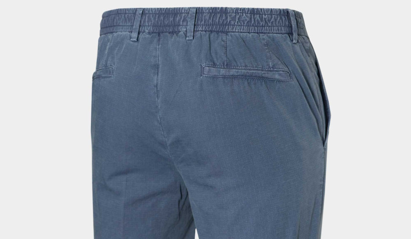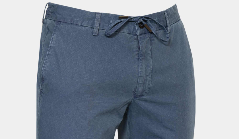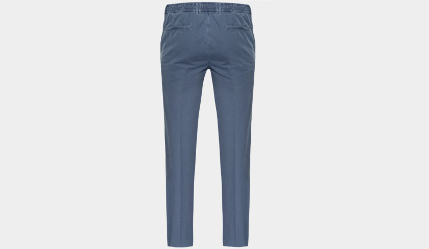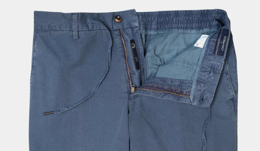 These Germano trousers are expertly tailored in Italy from a premium blend of 97% cotton and 3% elastane, finished with an eco-dyed treatment for a more vintage touch. The result is a lightweight, breathable, and slightly stretchy cloth that ensures all-day comfort. The slim fit silhouette creates a sharp, modern profile, while the drawstring waistband adds a relaxed touch, allowing for both versatility and ease. The blue hue lends itself beautifully, especially during spring and early styling, pairing effortlessly with polos, linen shirts, or soft knits. Expertly finished with clean stitching and a discreet check texture, these trousers reflect Germano’s dedication to Italian craftsmanship.