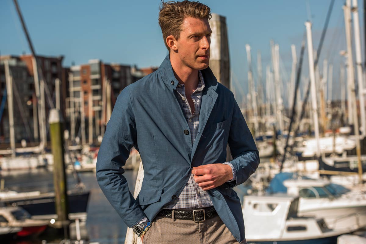 Sophisticated, elegant though casual, the blue Montedoro outdoor jacket is the perfect layering piece for the colder days. The coat is cut slim out of pure, water repellent cotton, a great seasonal fabric. Combine it with a brown printed shirt from Luigi Borrelli and a pair of Incotex trousers for more structure and put some higly comfort Hogan brogues in blue nubuck leather for a relaxed and stylish look.