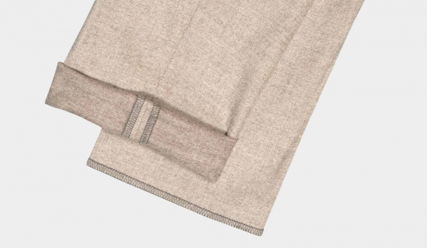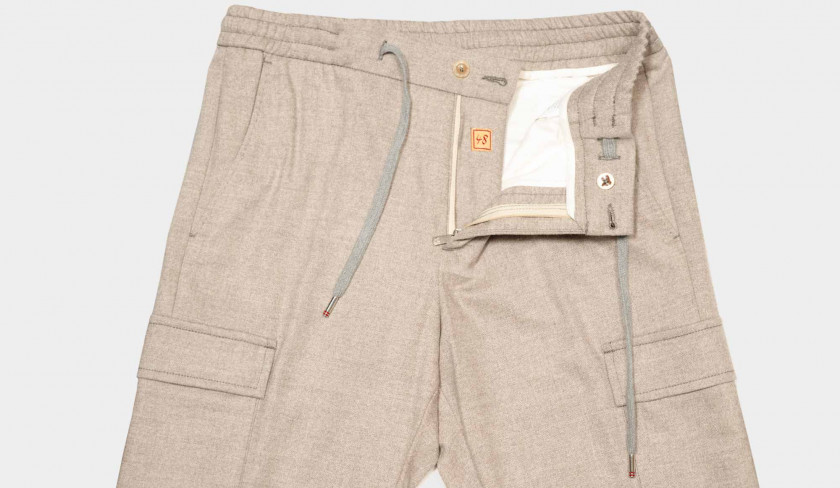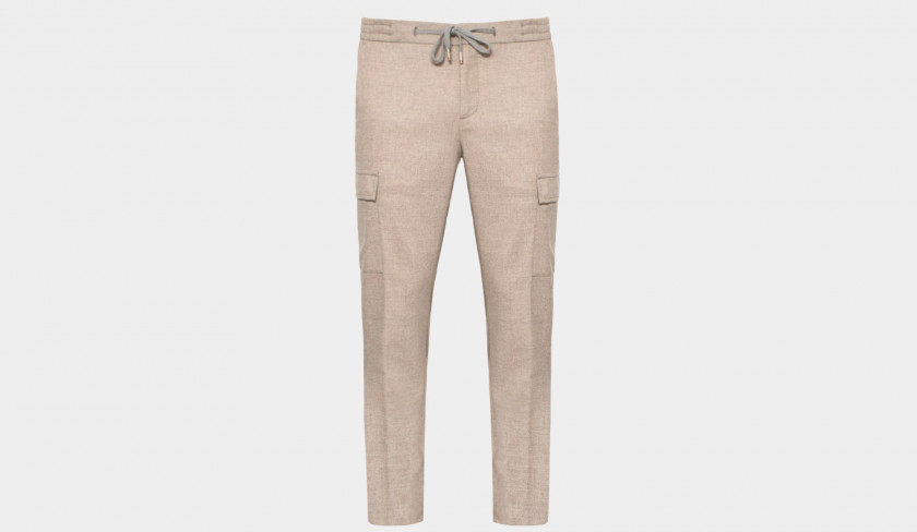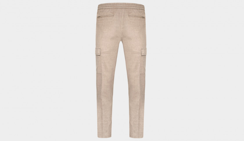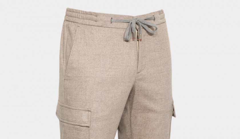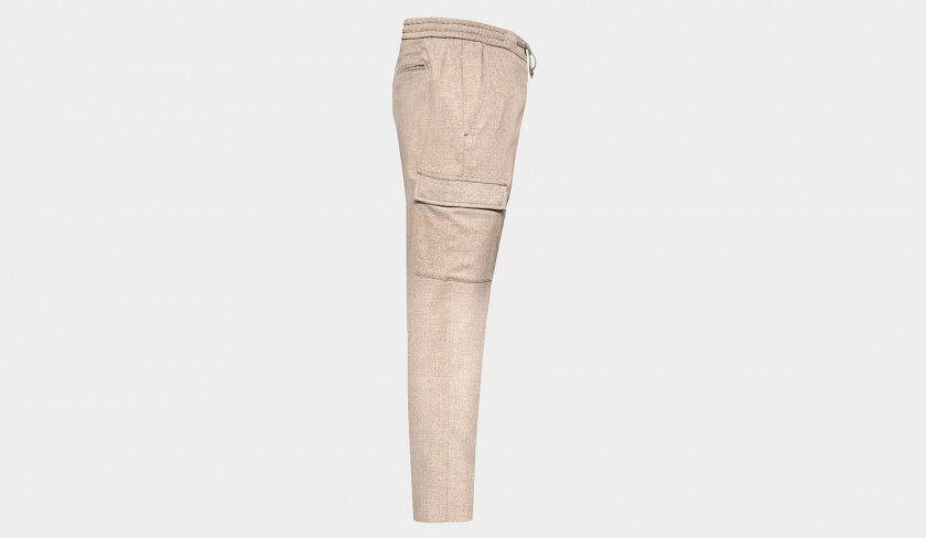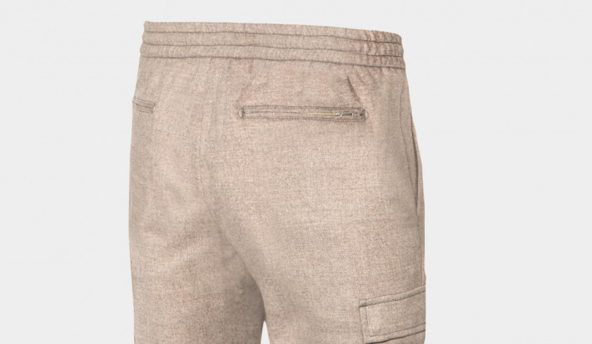 Luxury winter cargo trousers, in grey-blue melange, wool-cashmere-stretch flannel fabric. This cargo model 'TOR', made by Napoli based luxury trousers maker Marco Pescarolo, has been realised by adding two side pockets on model 'Caracciolo', which is finished with an elastic waistband, button-drawstring closing and zippered back pockets. Cargo pants, also called combat pants after their original purpose as military workwear. Originally designed for rough work environments and outdoor activities, distinguished by two large utility pockets for carrying tools. Wear these comfy and soft trousers together with a flannel or denim shirt, heavy knit or cardigan and strudy boots or sneakers.