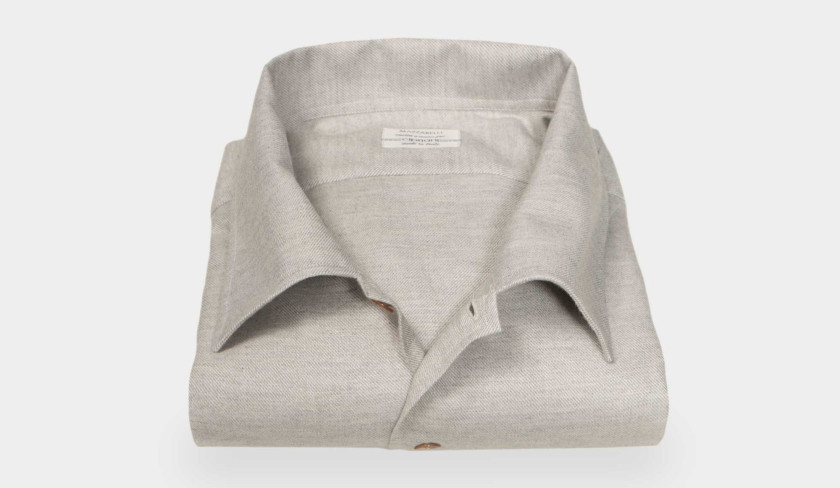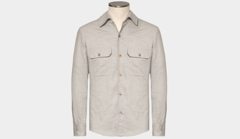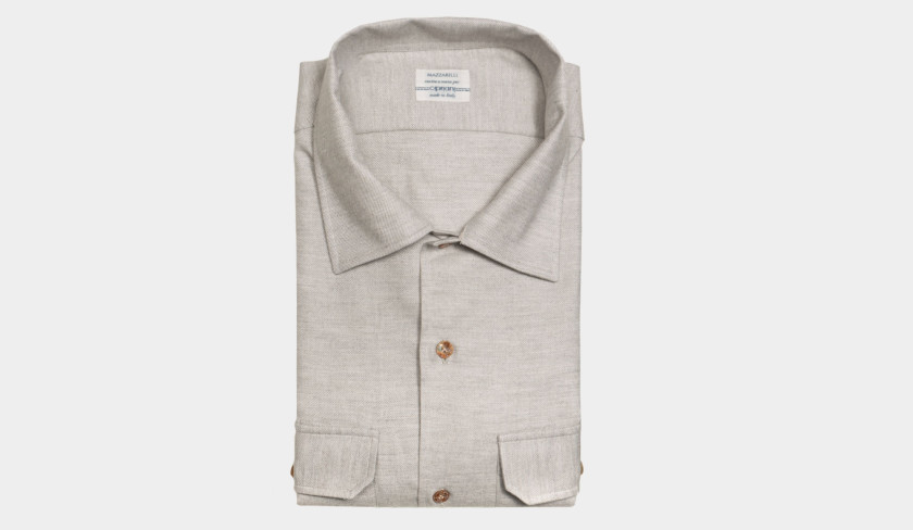 This grey overshirt from Mazzarelli is crafted from 100% brushed cotton twill fabric, giving it a soft-hand, almost flannel-like texture. The fabric’s gentle surface adds depth and warmth, making it ideal for layering over a t-shirt or under a blazer through the cooler months. Designed with a utility-inspired silhouette, it features two chest flap pockets, stunning horn-style buttons, and a structured collar that balances elegance with a relaxed attitude. The brushed cotton provides a comfortable, lived-in feel, while maintaining the precision and polish that define Italian tailoring.