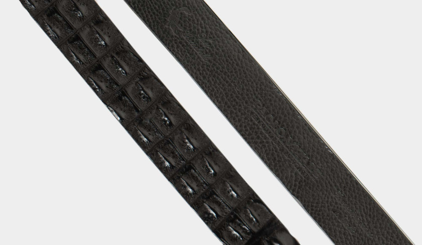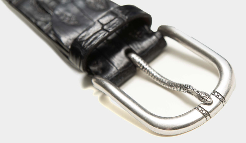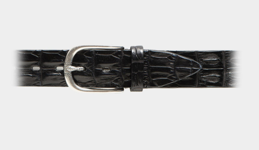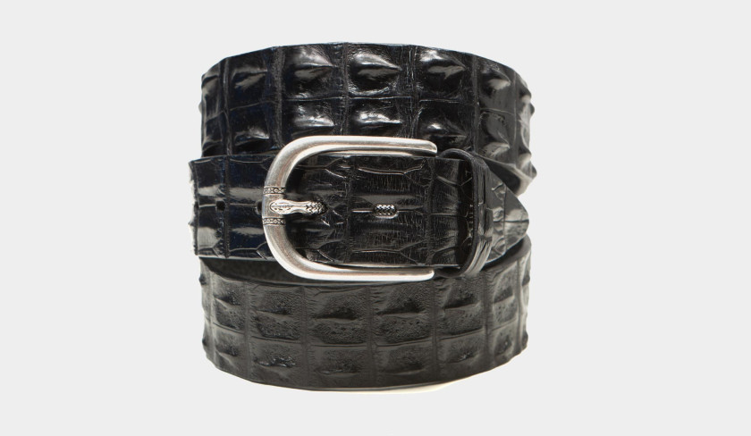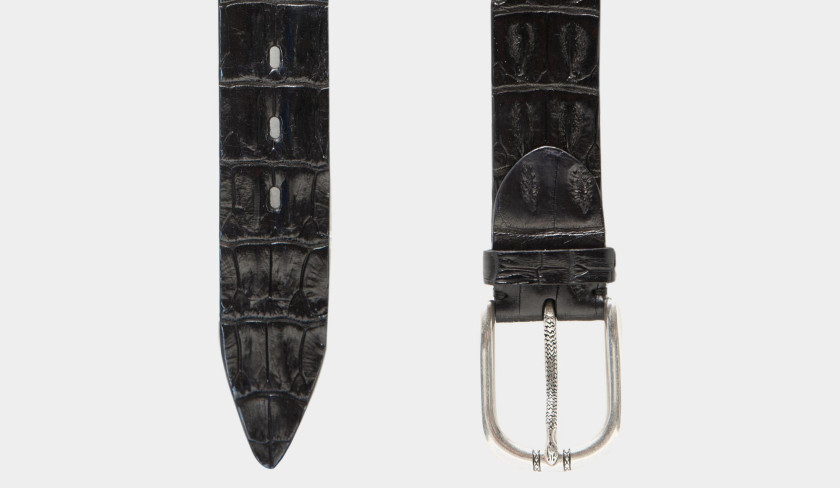 Handmade in a precious leather skin, this black crocodile horn back is cut in a width of 4 cm to give this belt a smart casual feel. The solid brass buckle includes a beautiful detail referring the use of the exotic skin, the engraved pin is finished like a piece of jewelry. Can easily be adjusted to other sizes, or as you prefer, done by us before shipping.