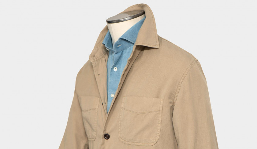 Summer stylish beige overshirt by Richard J Brown, crafted from lighter-weight, soft cotton fabric. Designed with two stylish chest pockets and a versatile collar, that can be worn up or down. Features brown horn button closures and buttoned cuffs for a polished look. Pair with light colored jeans or chinos, over a linen tee, denim shirt or light crewneck.